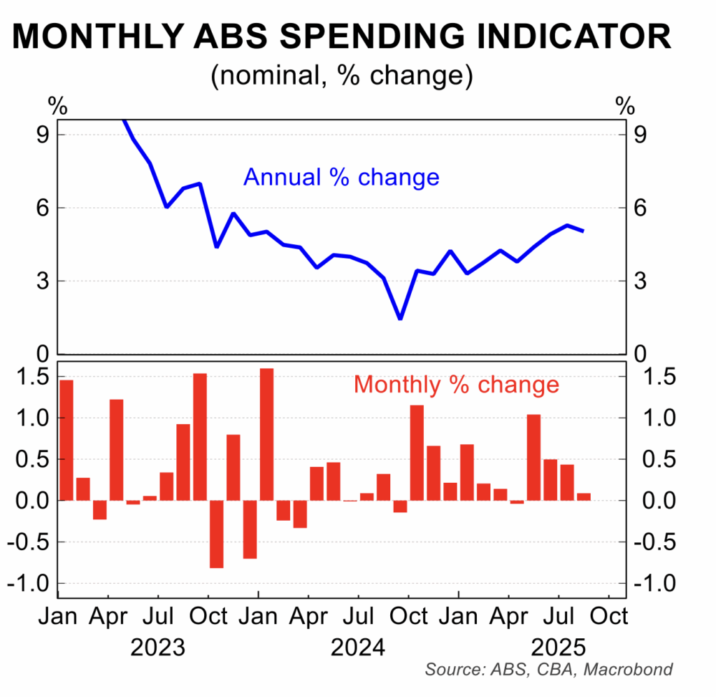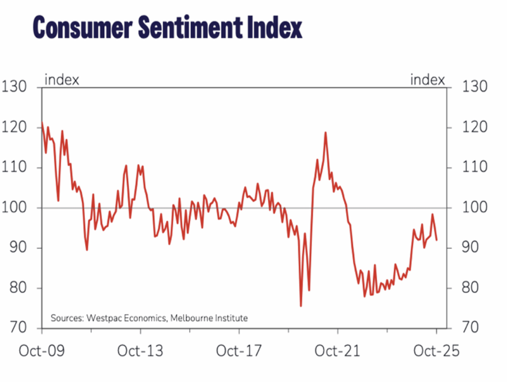- Consumer sentiment fell for a second straight month in October to partly reverse what was a more positive tone earlier in 2025. The Westpac-Melbourne Institute index fell 3.5 per cent to 92.1 points, a level which has more pessimists than optimists in the household sector. The main area of recent weakness was in the outlook for family finances.