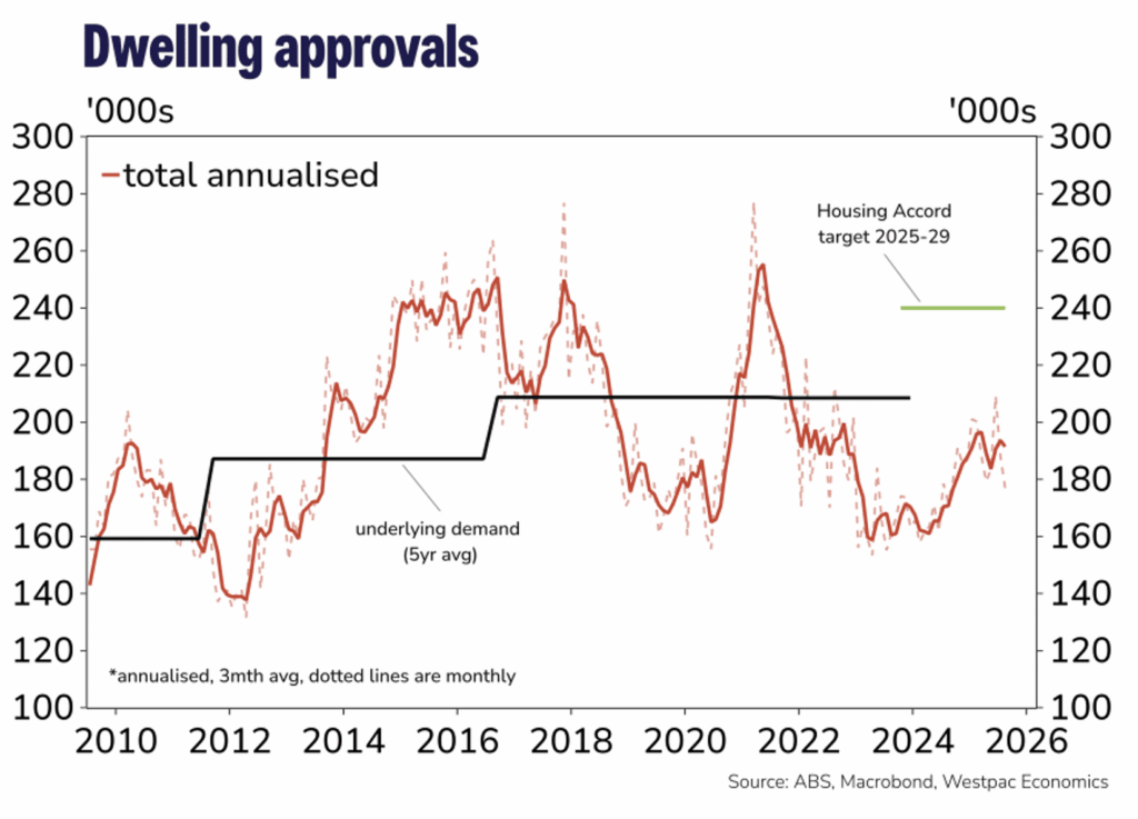 - There have been disappointing and sharp falls in the number of dwelling building approvals in last two months, with the falls totalling 15 per cent. This has unwound about half of the upturn that was evident earlier in 2025. The faltering of housing construction presents problems not just for economic activity but also for much needed housing supply. The government’s plan, for 1.2 million new dwellings in the 5 years to mid 2029, is unlikely to be met.