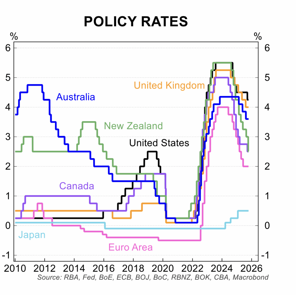 The unemployment data sparked a major repricing for interest rate futures. An interest rate cut on 4 November is now close to 75 per cent, with rates priced in to fall to 3.10 per cent from the current 3.60 per cent in the first half of 2026. Interest rate cuts continue to play out in the US, Canada, New Zealand and the UK.