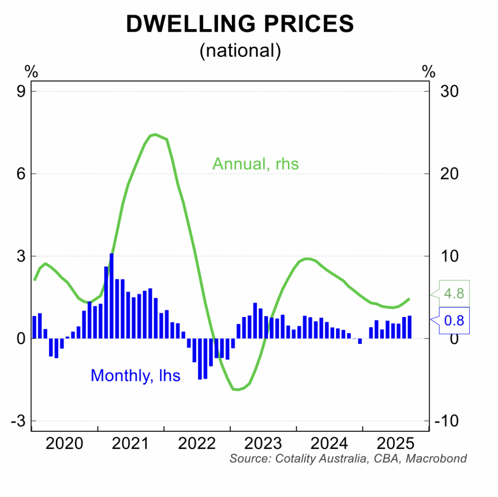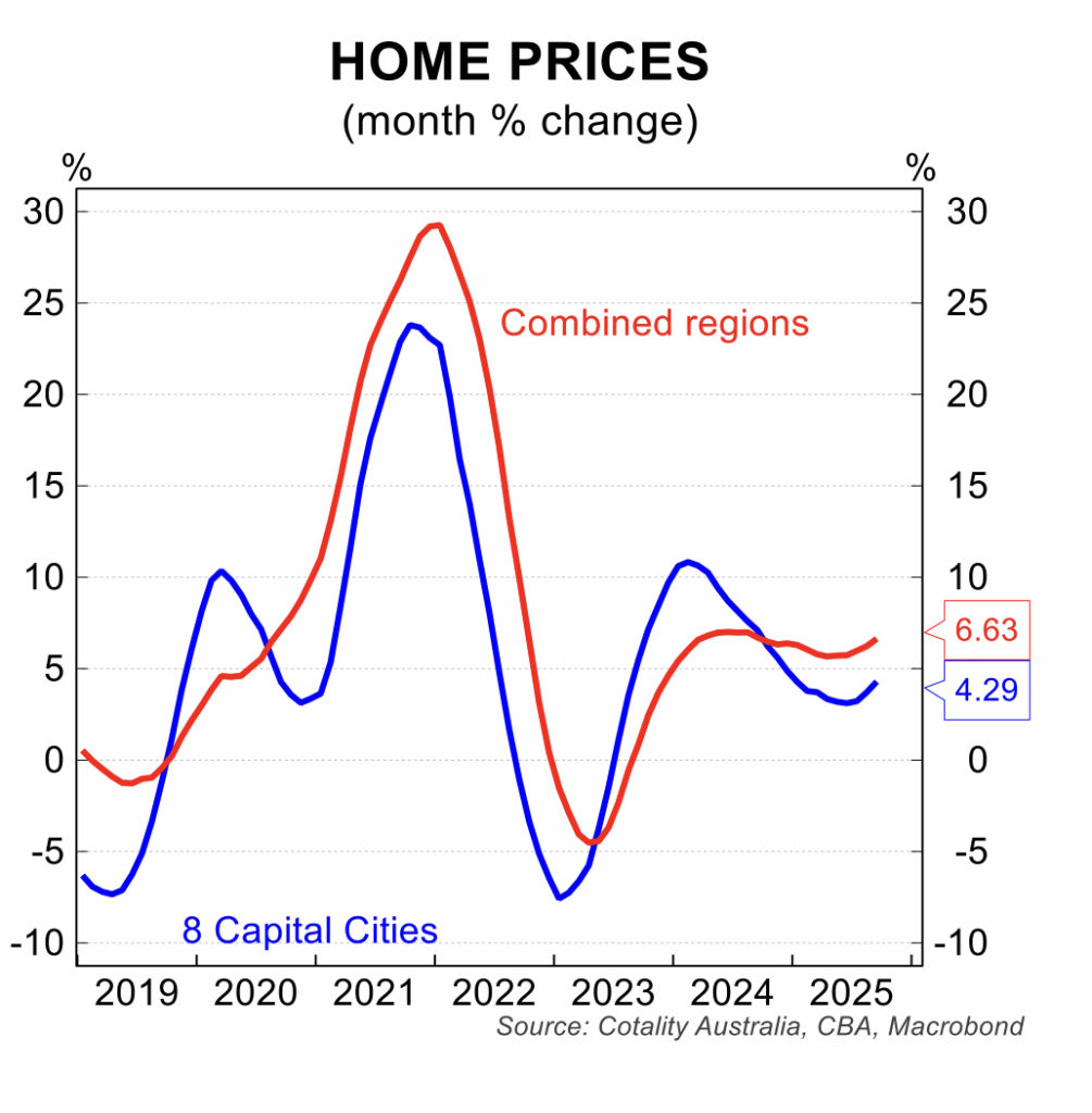The lift in house prices has gained further impetus in September, with prices rising 0.8 per cent to be 4.8 per cent higher than a year earlier. Price increases were registered in all capital cities with Darwin rising 1.7 per cent, Perth 1.6 per cent, Brisbane 1.2 per cent and Adelaide 0.9 per cent, the strongest. Regional areas continue to see solid price gains. The Cotality data for the first half of October points to further price gains.