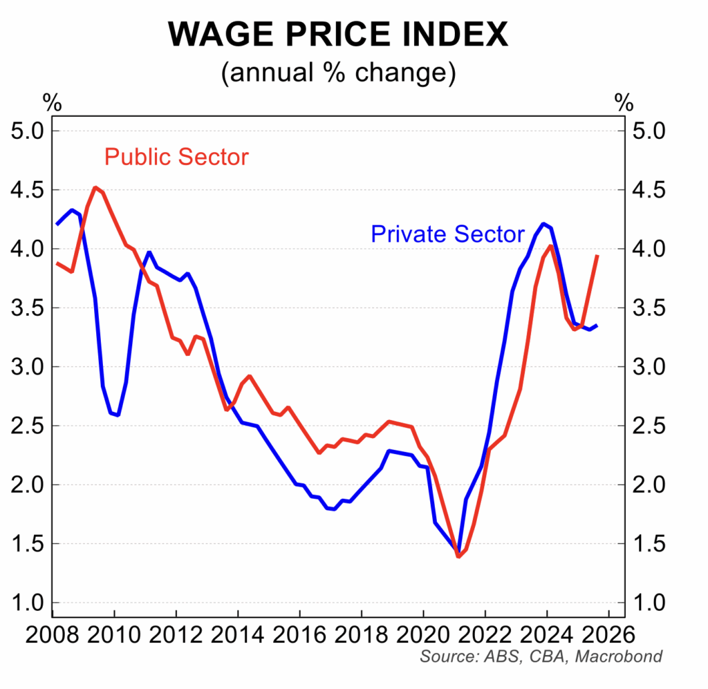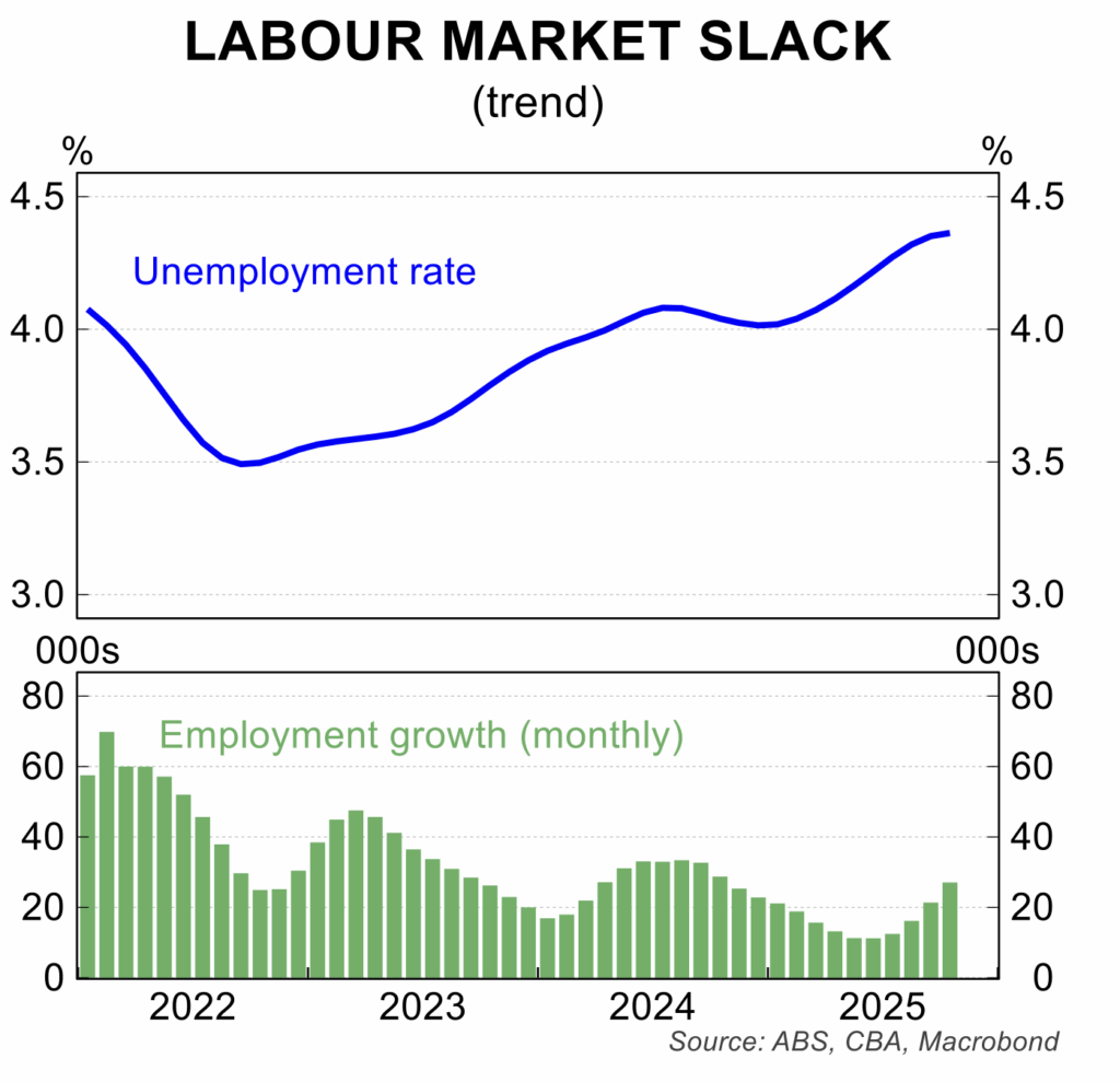 • The unemployment rate remains volatile – it fell to 4.3 per cent in October having spiked to 4.5 per cent in September. This is an increase from 4.0 per cent at the start of 2025. After five months of very moderate growth, employment rose 42,000 in October with the rise focussed on full time jobs. The outlook for the labour market remains problematic with job ads continuing to fall.