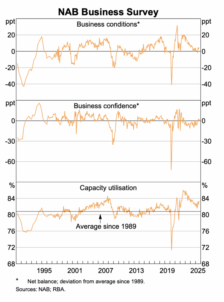 • The NAB business survey has been mixed but more positive than consumer sentiment. In September, business conditions were unchanged at +8 index points, to be around the long run average, while business confidence edged up 3 index points to +7 points to remain at around levels seen since mid-2025. There were moderate improvements in reported trading conditions and profitability, while expected employment continued to be subdued.