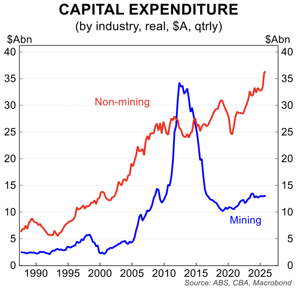 - Private sector business investment rose 0.4 per cent in the December quarter after jumping 6.4 per cent in the September quarter to lock in a solid upswing in capital expenditure. Encouragingly, non-mining investment is driving the recovery which is an important element in delivering a much-needed increase in productivity (the red line in the chart below). Businesses expect capital expenditure to rise a further 7 per cent in FY2026-27.