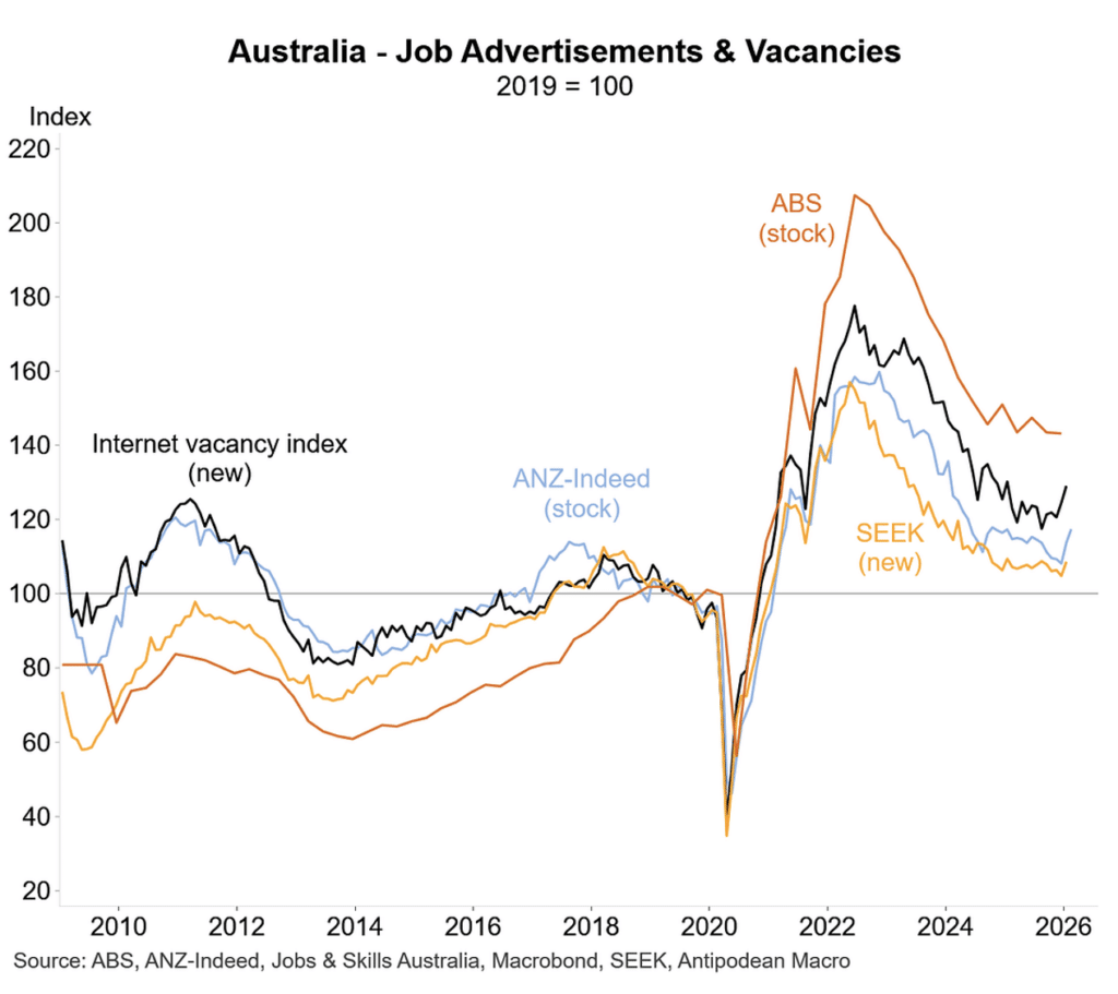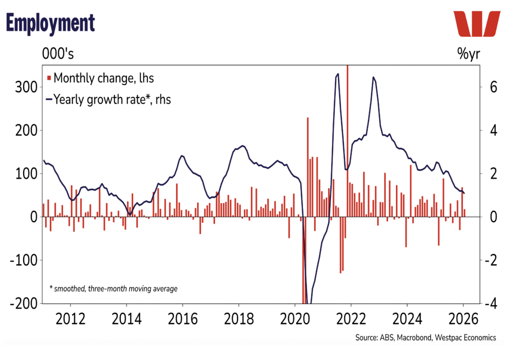- The unemployment remained at 4.1 per cent in January, confirming a turning point lower after a period of rising unemployment through 2024 and most of 2025. Employment growth was a moderate 18,000 in January which saw the annual increase in employment slow to 1.0 per cent, the slowest yearly increase in almost a decade (the black line in the chart below). Of note and as a sign of a cooling in labour market conditions, the workforce participation rate and the employment to population ratios have both fallen sharply over the past year.