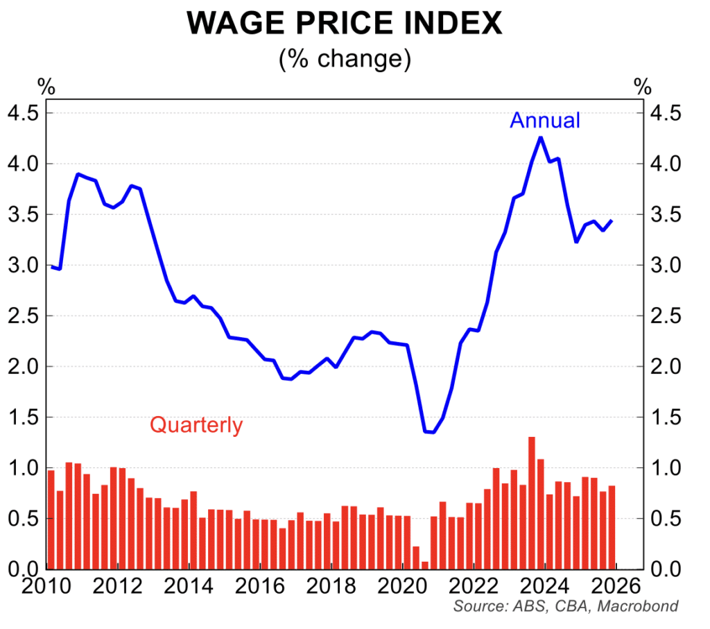 - The wage price index rose 0.8 per cent in the December quarter for an annual increase of 3.4 per cent. The annual rise in wages has been between 3.25 and 3.5 per cent for the past year, which is down from the peak of 4.25 per cent in late 2023 and early 2024. The current wage dynamics are consistent with inflation tracking around the mid-point of the RBA’s 2 to 3 per cent target. The wages data are also consistent with a moderation in the labour market conditions.