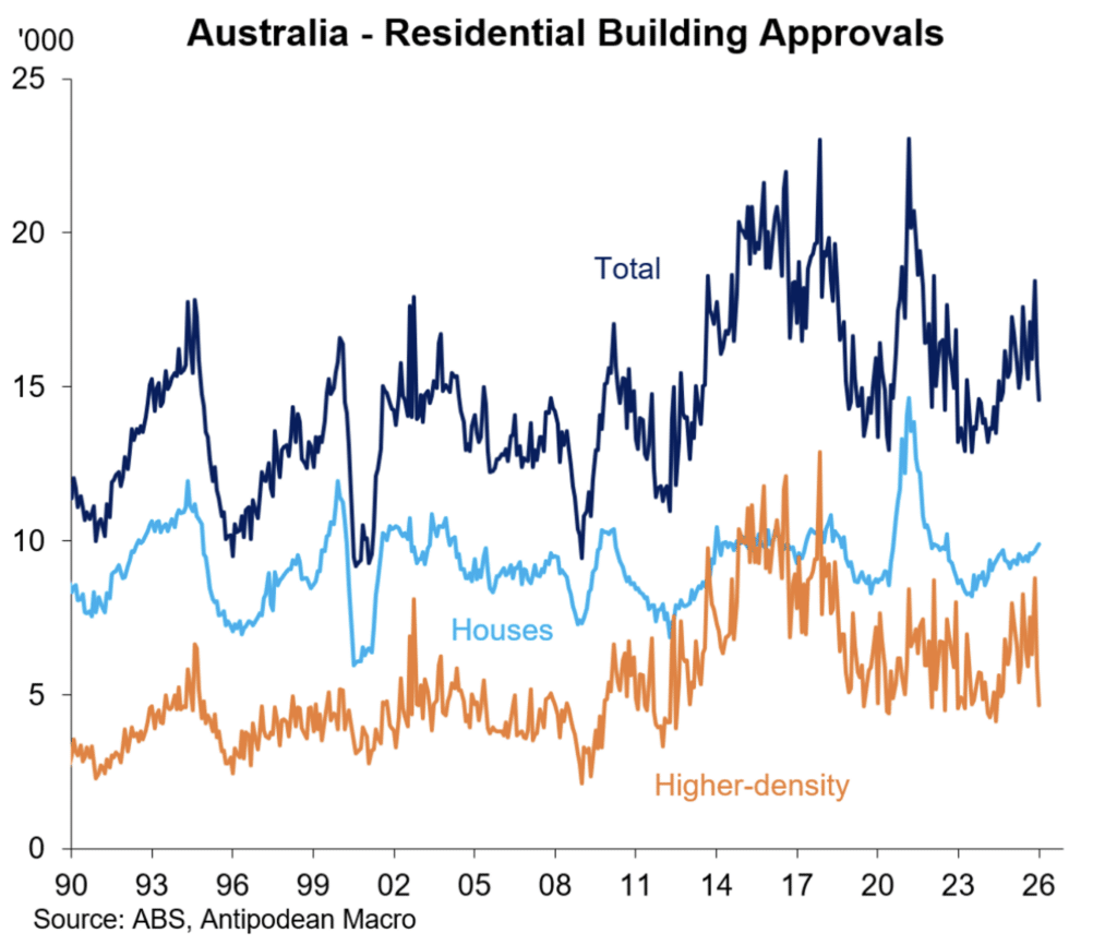 - The number of new building approvals has been very disappointing in recent months. Residential approval fell 7.2 per cent in January which brought the cumulative fall since September 2025 to 15 per cent. After an encouraging lift in approvals through the bulk of 2025, the recent decline will hold back much needed supply, which is a critical factor in helping to deal with housing affordability. There is little chance of the government meeting its target for 1.2 million new dwellings in the 5 years to 2029. A figure closer to 1 million is more likely.