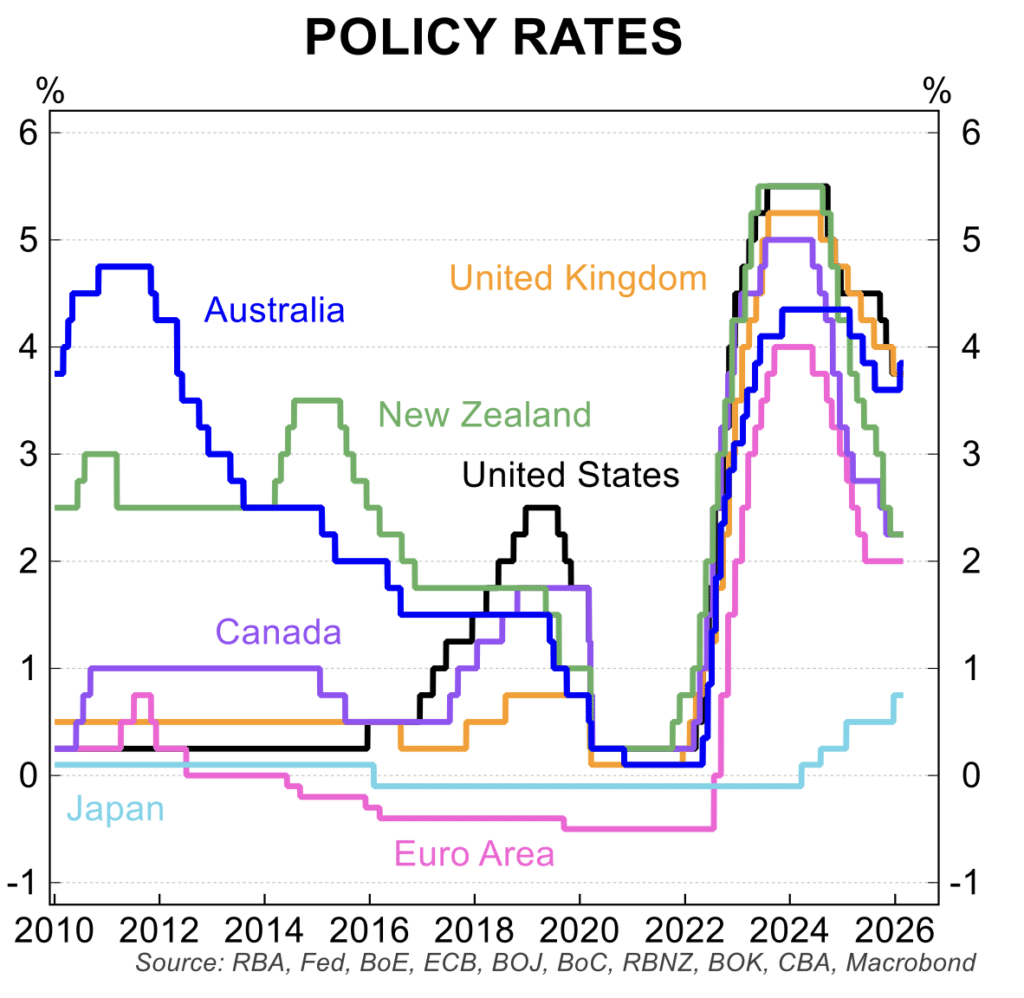 Monetary policy settings overseas remain caught between ‘on hold’ or the ‘possibility of further cuts’, especially in the US and UK. The near-term inflation and economic growth momentum will determine whether the relative calm can be sustained.