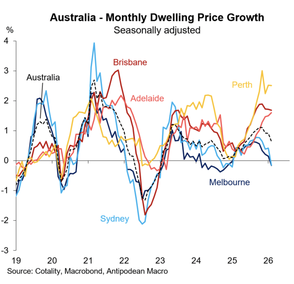 House prices are rising but at a slower pace than was seen in the middle of 2025. Prices in Melbourne and Sydney are weak, but remain very strong in Perth, Adelaide and Brisbane.