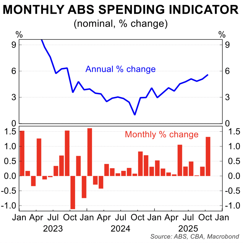 - After two months of softer results, household spending growth jumped a strong 1.3 per cent in October to be 5.6 per cent higher than a year ago. The annual growth rate was at a two year high. While the pick up was in part due to spending related to the black Friday sales, household finances are benefiting from the three rate cuts to date, steady wages growth and the wealth effect from rising house price and gains in the stock market.