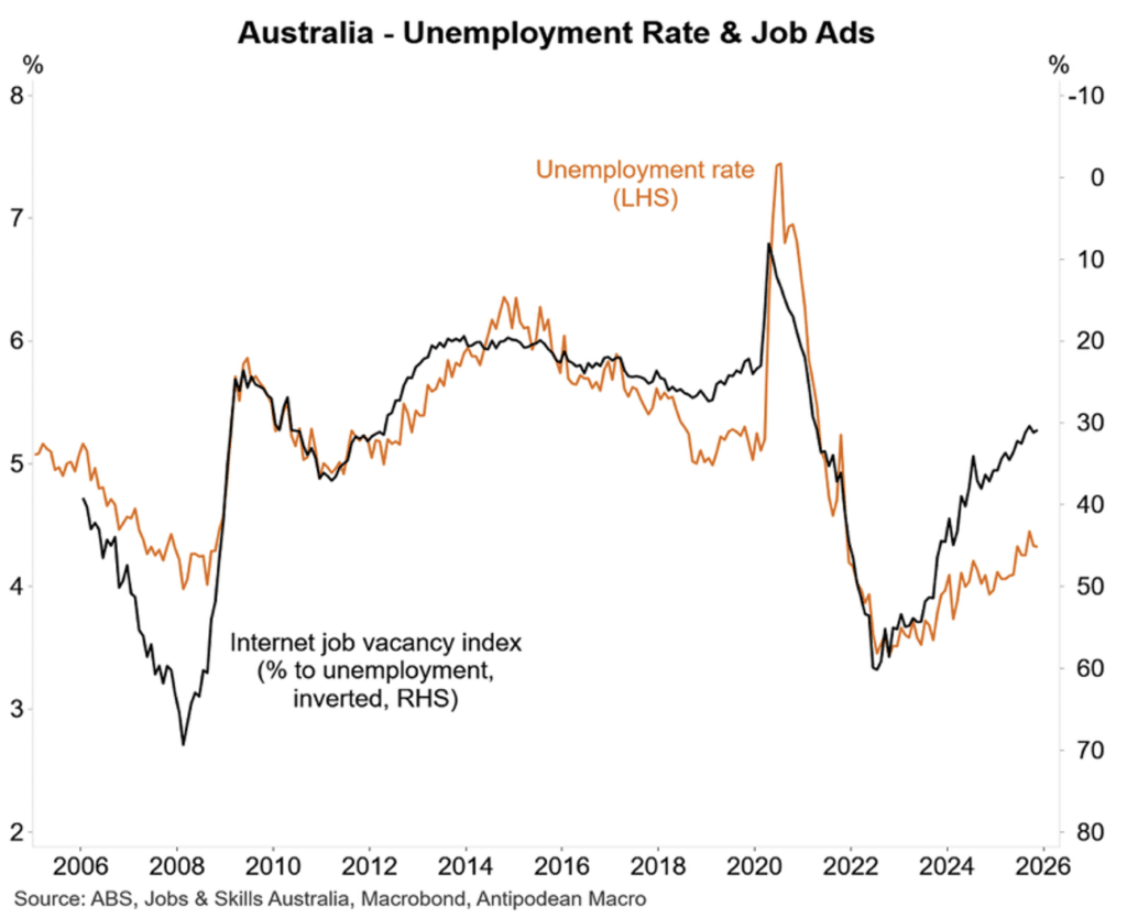 - The labour market data remain soft. Employment fell 21,000 in November, driven by a 57,000 fall in full time jobs. In the last four months, the average monthly increase in employment is just 5,000, the weakest result in the post pandemic era. While the unemployment rate was steady at 4.3 per cent, the underemployment rate rose to a 14 month high of 6.2 per cent. The number of hours worked in the economy continues to weaken. With job ads and vacancies still falling to fresh lows in the current cycle, the outlook is for further weakness in the labour market in the months ahead.