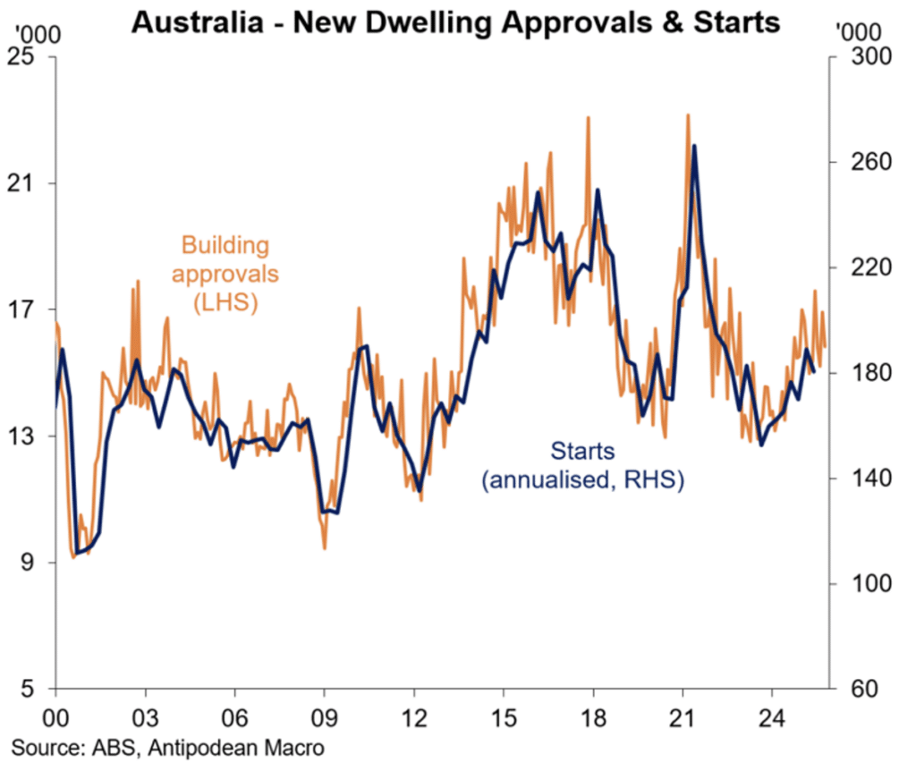 - There remains volatility in the monthly number of building approvals. After a rise of 12 per cent in September, building approvals dipped 6 per cent in October. The general trend remains towards an upturn, aided by lower interest rates and various measures from the government that are designed to fast track new building. 2026 looks like it will be a strong year for dwelling construction.