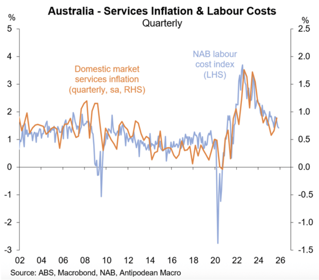 At the same time, and at odds with this better news, the labour market has shown signs of softness. The upturn in inflation is a concern for the RBA despite the fact that the drivers of the inflation increase appear to be one-offs.