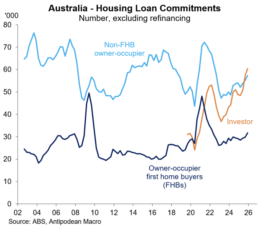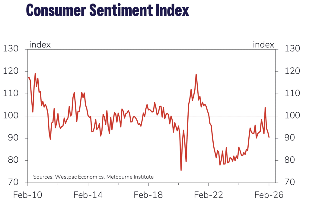 • Consumer sentiment fell 2.6 per cent in February with ‘current conditions’ and the ‘medium term outlook’ weakening. At 90.5 index points, sentiment remains at a level where there are more pessimists than optimists. This suggests downside risks to aggregate household spending in early 2026.
