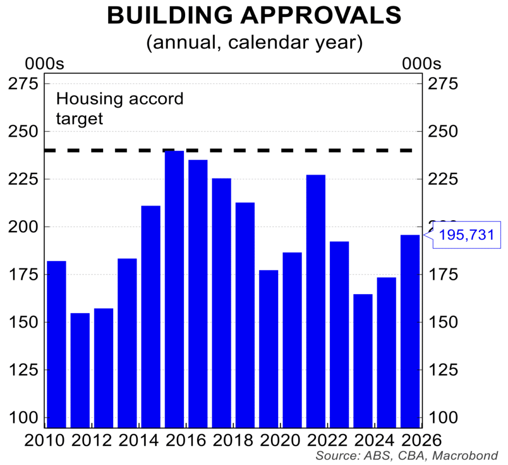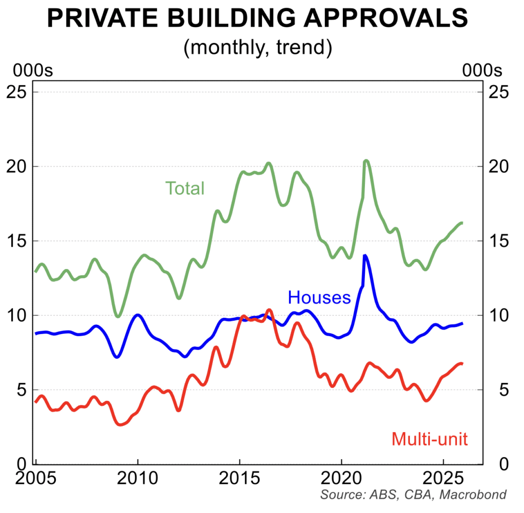 • Having risen strongly during 2025, the number of new building approvals has stalled. The number of dwelling building approvals fell 15 per cent in December after rising 13 per cent in November. This is a pattern in concentrated in approvals of multi-units and apartments. That said, the number of new dwelling approvals has risen in each of the last two years.