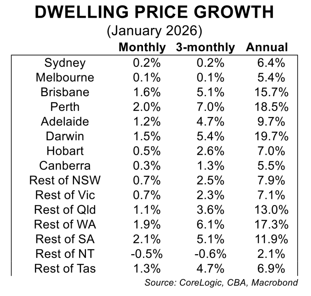 Supply shortage, strong underlying demand and resilience in the labour market continue to support rising house prices. Dwelling prices rose 0.8 per cent in January, a slight up tick from 0.6 per cent rise in December. Dwelling prices rose 9.4 per cent over the year to January.