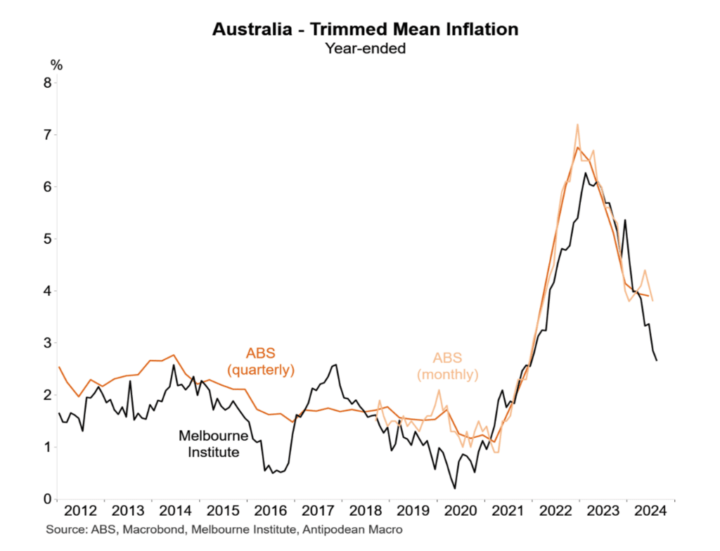 Despite ongoing hawkish rhetoric from the RBA, which included comments that interest rate cuts before the end of 2024 are very unlikely, markets are pricing in a high probability of a 25 basis point cut before year end and a total of more than 100 basis points of interest rate cuts by the end of 2025. Investors are focussing on key fundamentals rather than the results of RBA inflation modelling when pricing in those cuts.